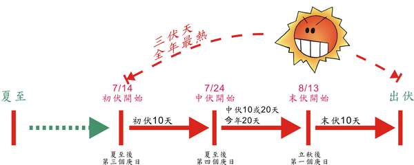 秋天屬「庚辛金」所以「入伏」要從「庚日」開始,溫度最高,需要潛伏的時間要在夏至後二十天以後,所以從夏至後第三個「庚日」開始,到立秋後第二個庚日結束。